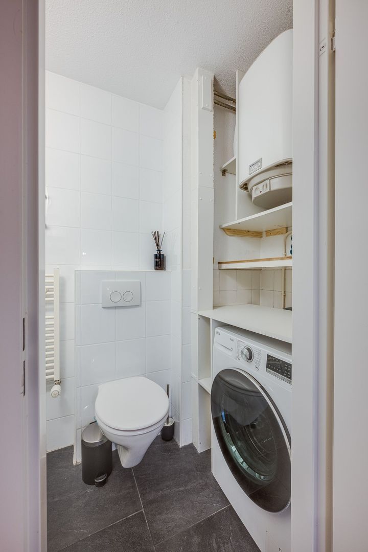 Aan de linkerzijde bevindt zich de badkamer. Deze is compleet uitgevoerd met een inloopdouche, wastafelmeubel en een hangend toilet. Ook vind je hier de warmwaterboiler én de aansluiting voor je wasmachine. Alles slim en efficiënt bij elkaar, zodat je geen ruimte verliest in de rest van de woning.