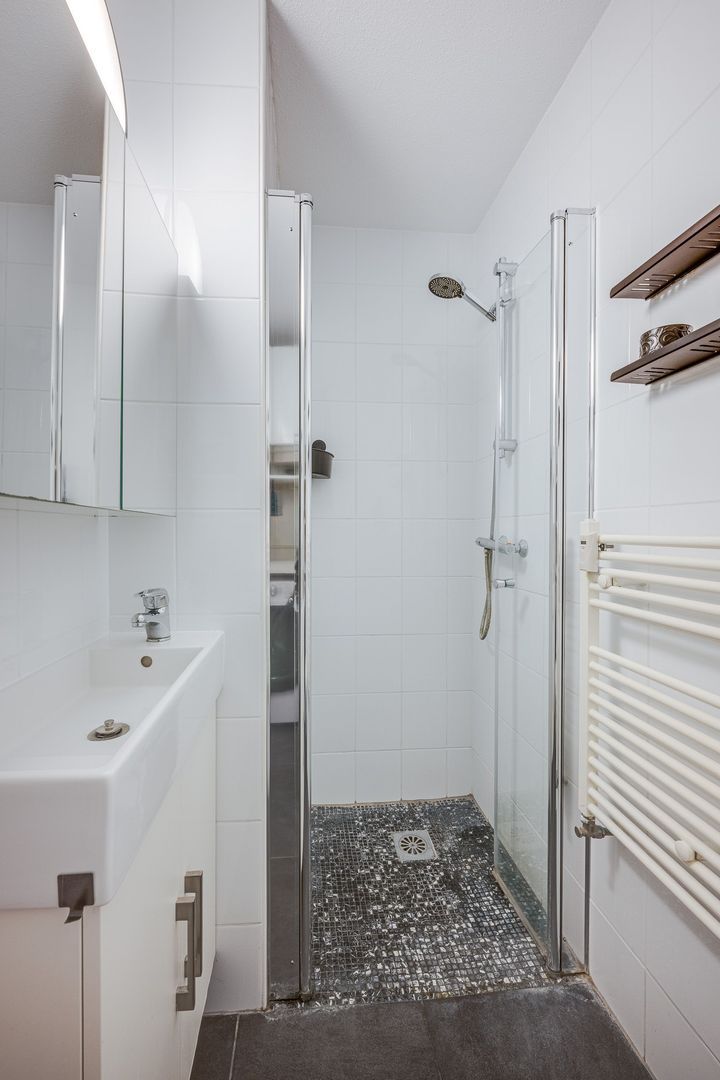Aan de linkerzijde bevindt zich de badkamer. Deze is compleet uitgevoerd met een inloopdouche, wastafelmeubel en een hangend toilet. Ook vind je hier de warmwaterboiler én de aansluiting voor je wasmachine. Alles slim en efficiënt bij elkaar, zodat je geen ruimte verliest in de rest van de woning.
