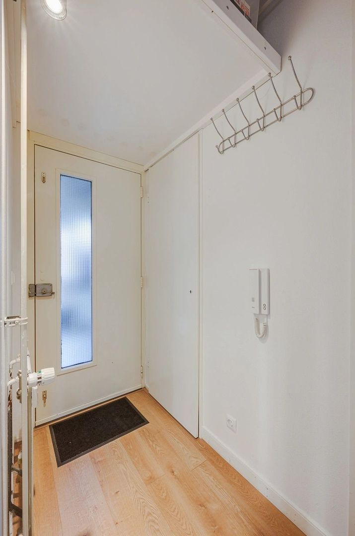 Via de centrale entree met brievenbussen bereik je je eigen voordeur. Je komt binnen in de gang met meterkast en ruimte voor een kapstok en schoenen.