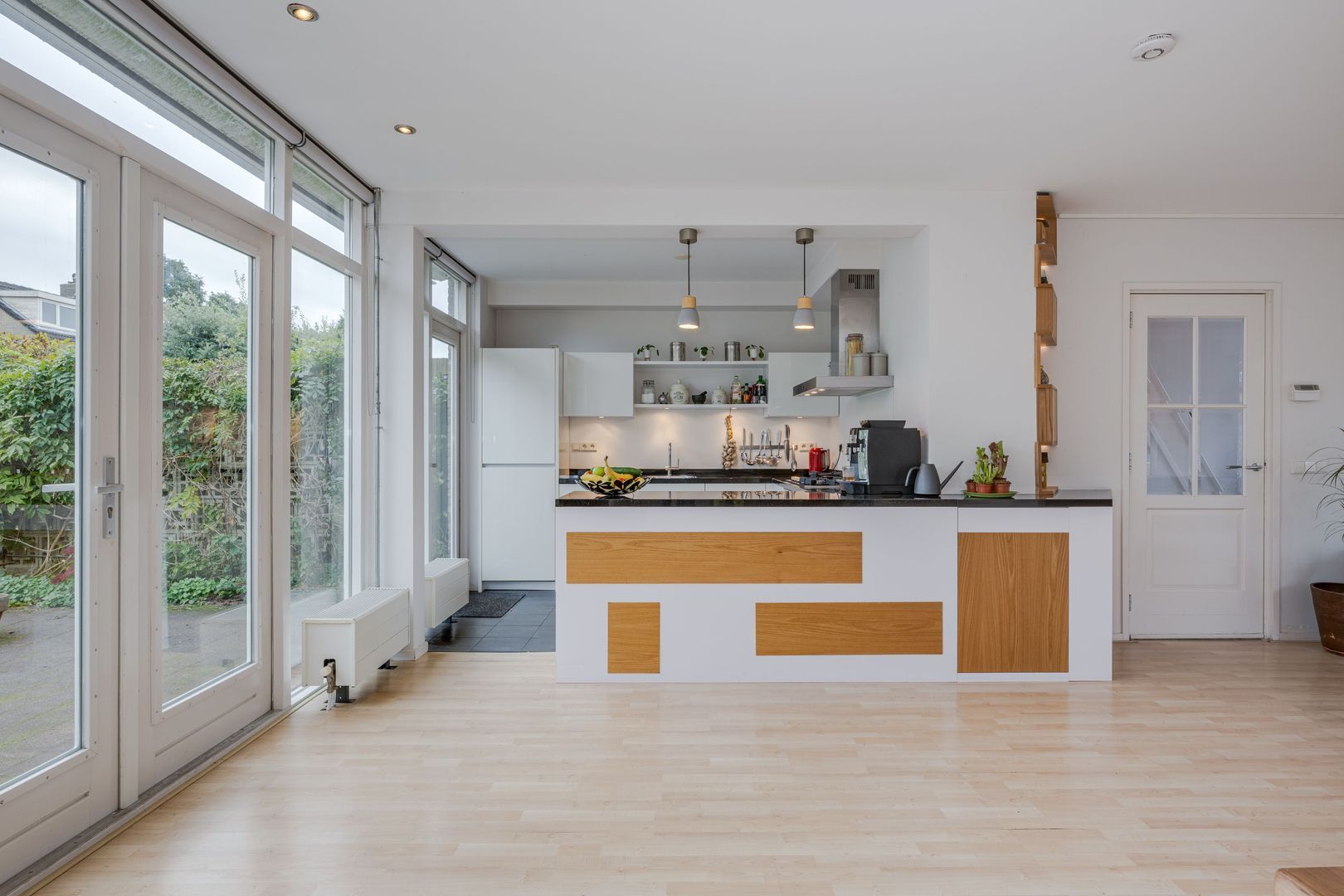 De keuken heeft eveneens royale afmetingen en is voorzien van diverse inbouwapparatuur en een groot kookeiland aan de woonkamerzijde. De ligging van de woning is gunstig (zuidoosten), waardoor je vrijwel de hele dag zon in de ruime achtertuin hebt. De openslaande deuren kunnen dan ook vaak open. In de tuin staat de garage (ca. 6,9 x 3 m), voorzien van elektra en een betonnen vloer.