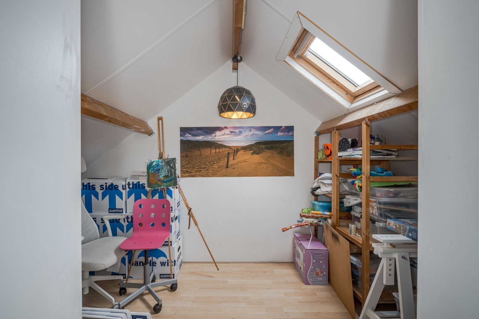 Tweede verdieping: Overloop met aansluiting voor wasmachine en droger, opstelling van de cv-ketel (Remeha Avanta HR-combi, 2006), dubbele wastafel en extra bergruimte. Daarnaast een ruime slaapkamer met grote vaste kast en bergruimte achter de knieschotten. De dakkapel is voorzien van rolluiken.