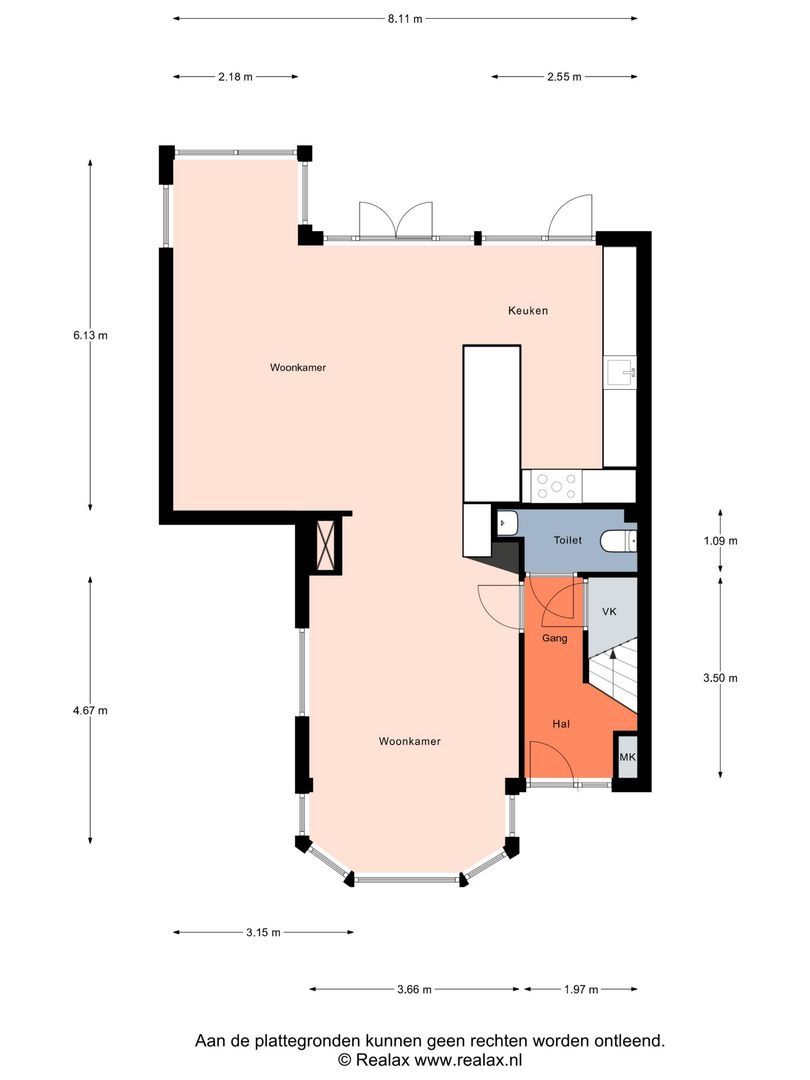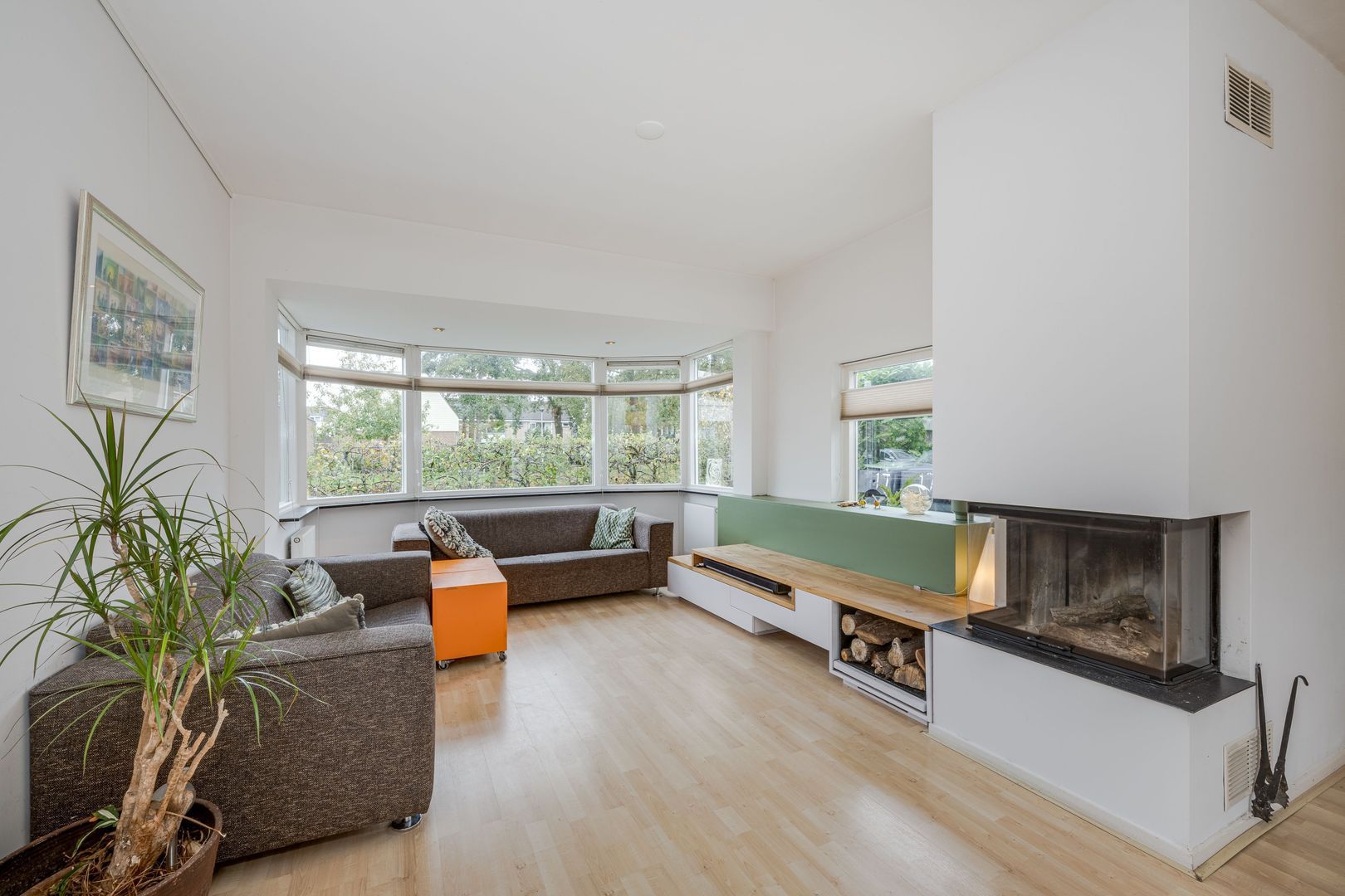 Indeling: Voortuin, entree van de woning met direct aan de linkerzijde de meterkast en garderobe. Trap naar boven met daaronder een handige trapkast. Vervolgens het ruime toilet met fonteintje. De woonkamer is opvallend groot en op meerdere plaatsen uitgebouwd: een flinke erker aan de voorzijde en een aanbouw aan de zijkant maken dat de woning aan de achterzijde ruim 8 meter breed is. De open haard heeft een mooie centrale plek in de woonkamer.