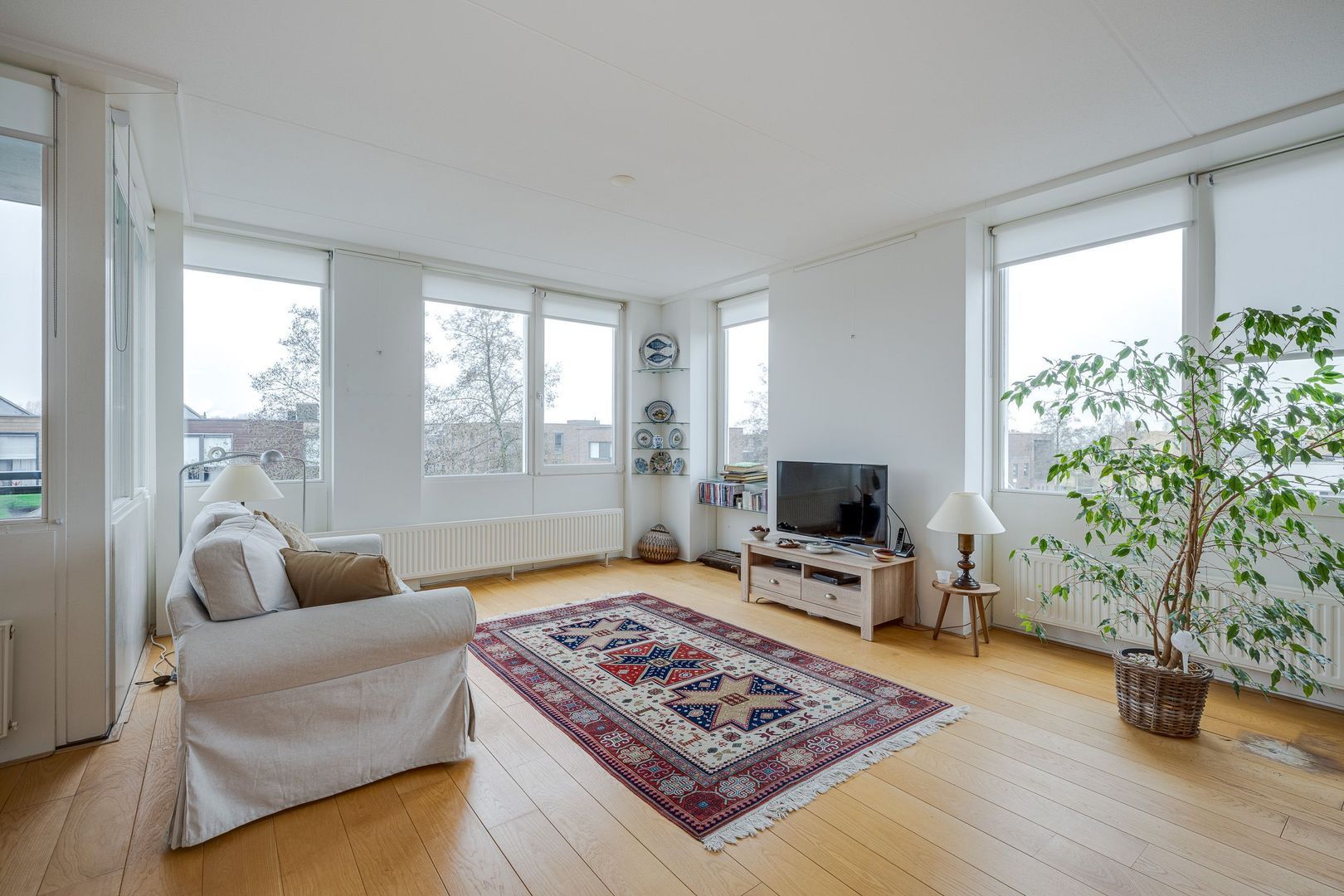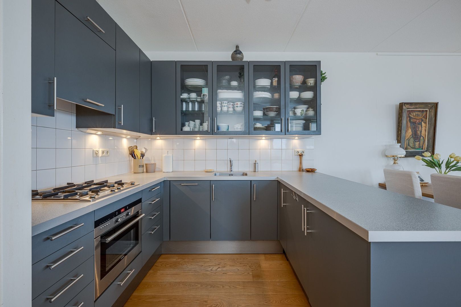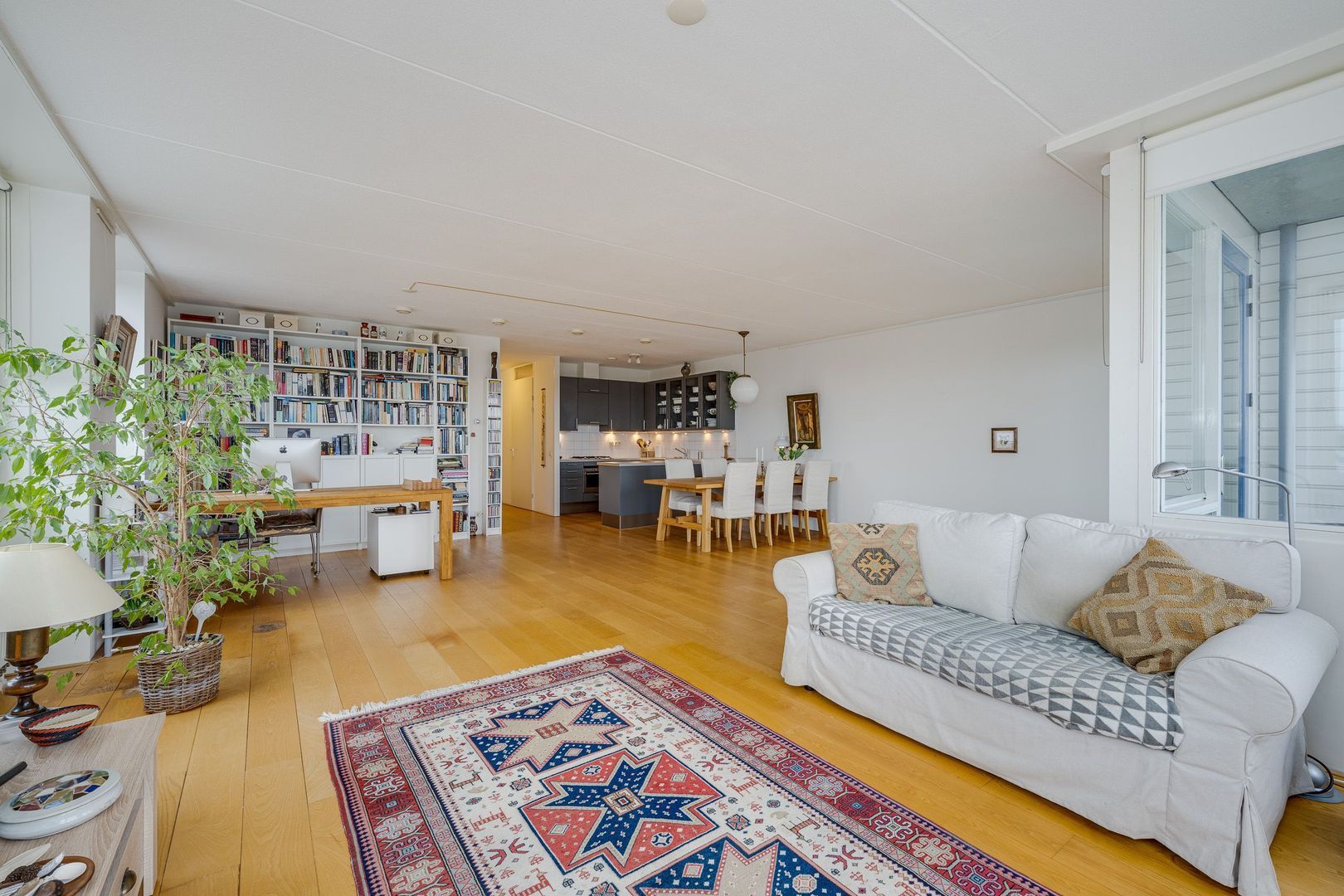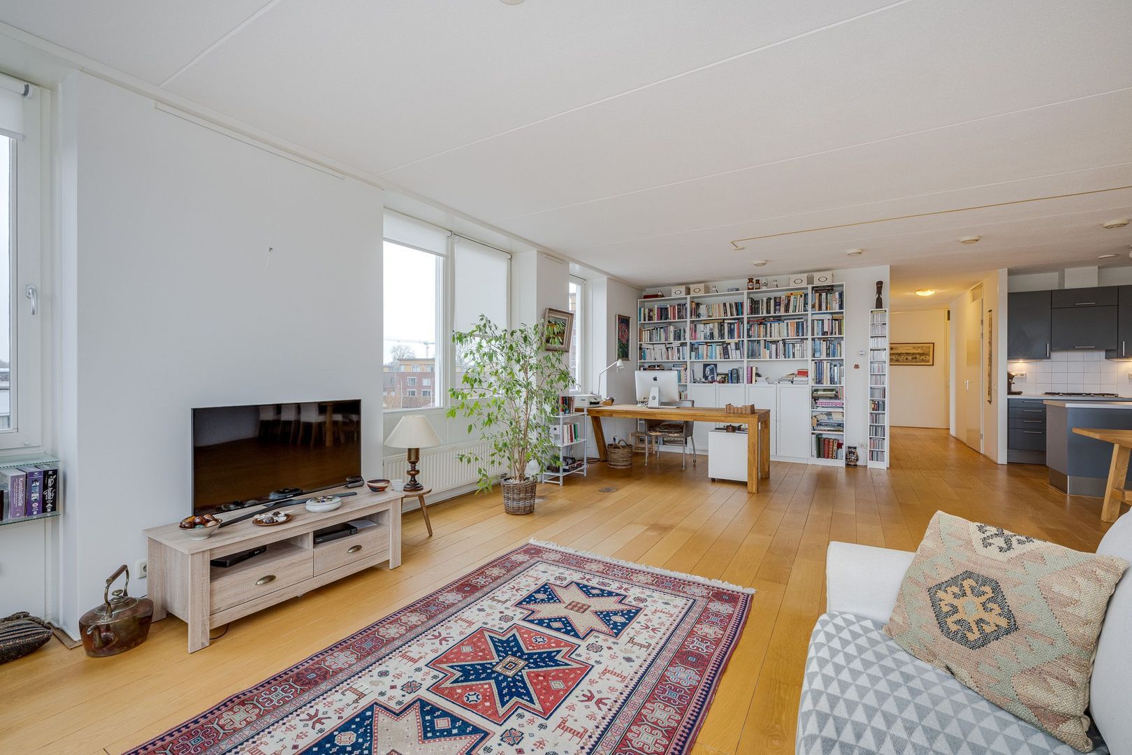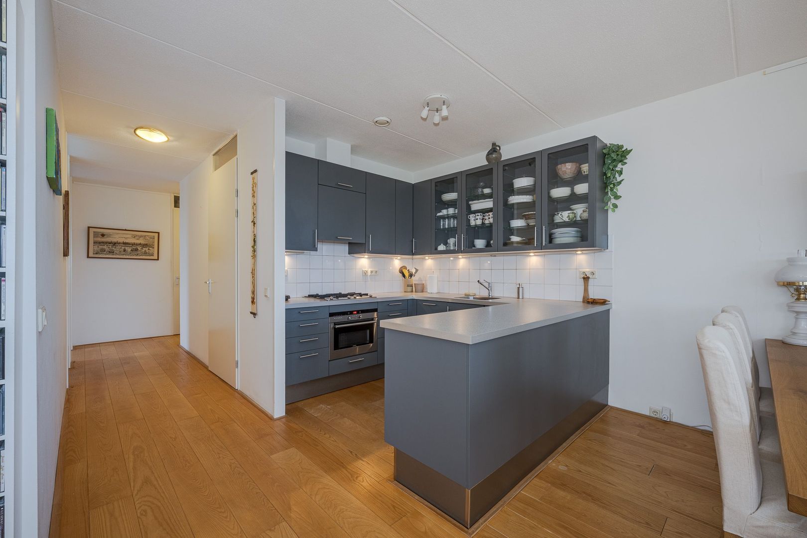 De royale woonkamer met open keuken vormt het hart van de woning. De keuken is voorzien van diverse inbouwapparatuur, waaronder een oven, vaatwasser, afzuigkap en een 4-pits gasfornuis. De woonkamer is ruim opgezet, heeft veel lichtinval en is afgewerkt met een houten vloer. Aan de zuidoostzijde ligt een balkon van circa 6 m², een fijne plek om van de zon te genieten.
